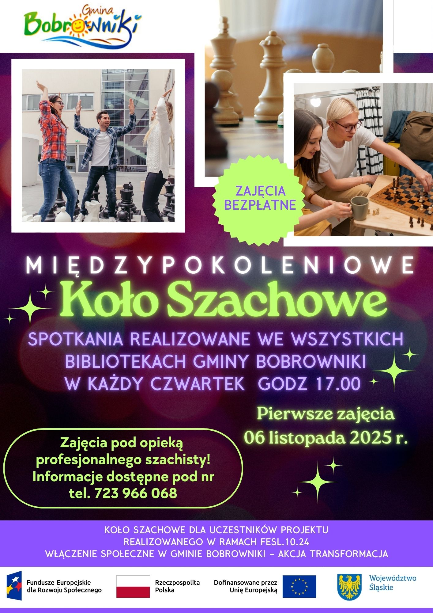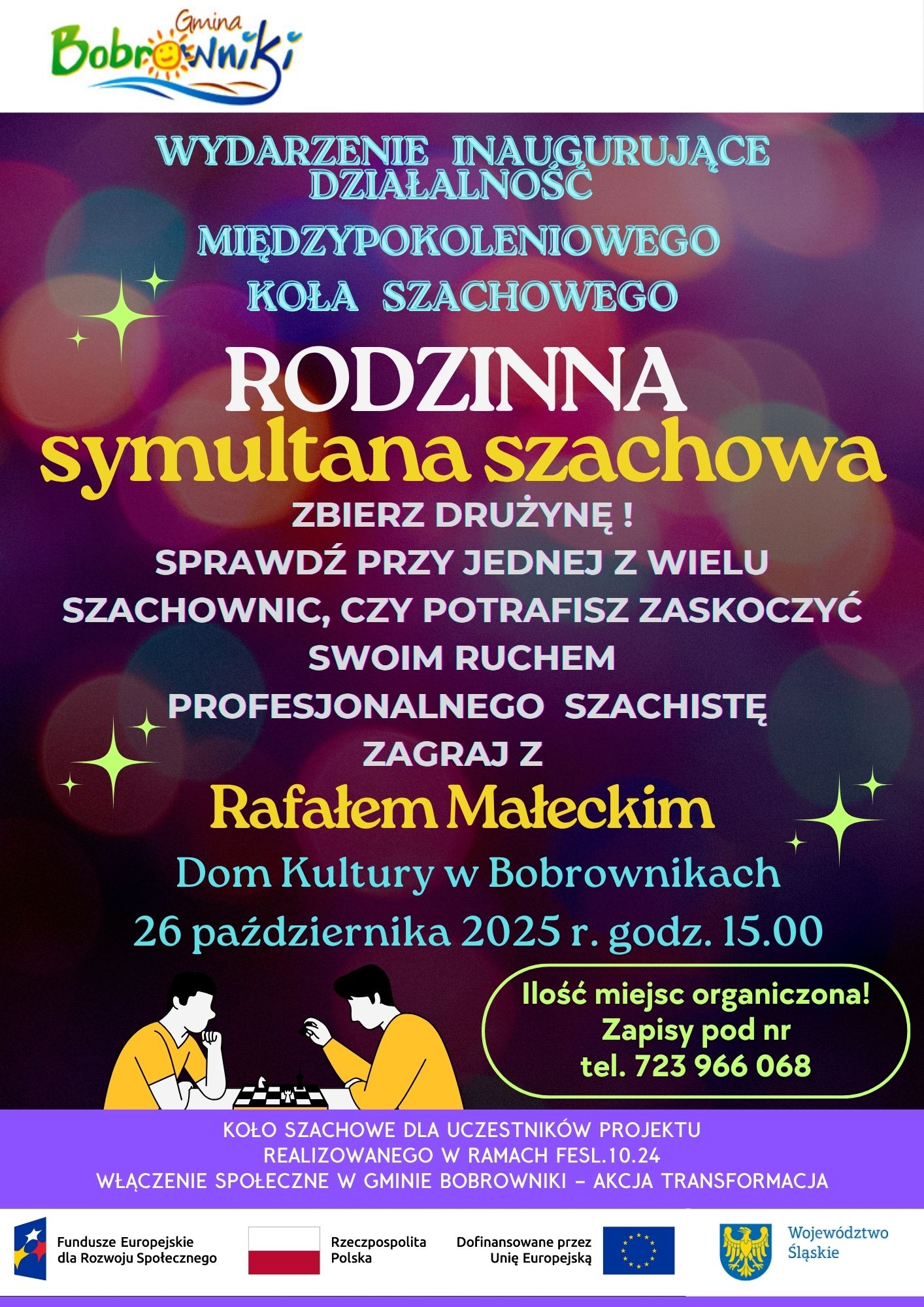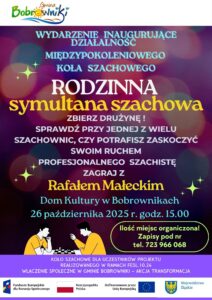 Ponadto w dniu 26 października 2025 r. o godzinie 15.00 odbędzie się Rodzinna multana szachowa z profesjonalnym szachistą – Rafałem Małeckim w Domu Kultury w Bobrownikach.