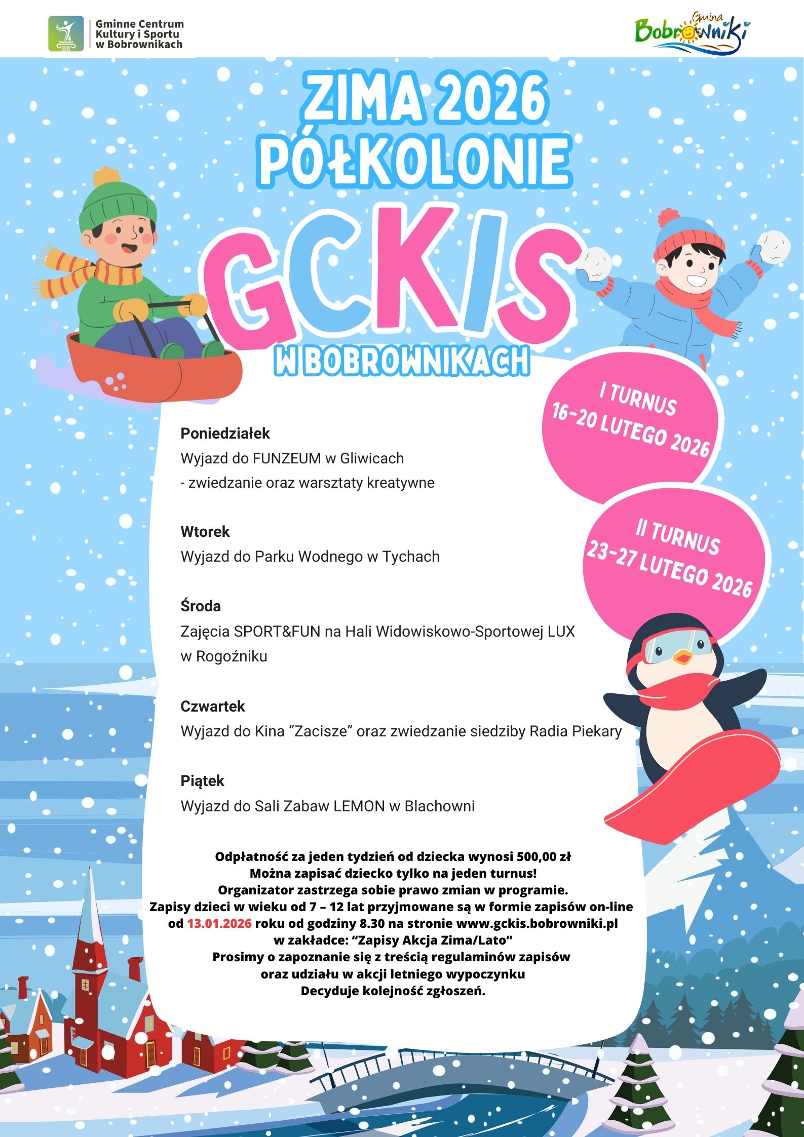 Zapisy przeprowadzone zostaną w formie on-line na stronie https://zapisy.gckis.bobrowniki.pl/ i rozpoczną się w dniu 13.01.2026 r. (wtorek) od godziny 8.30!