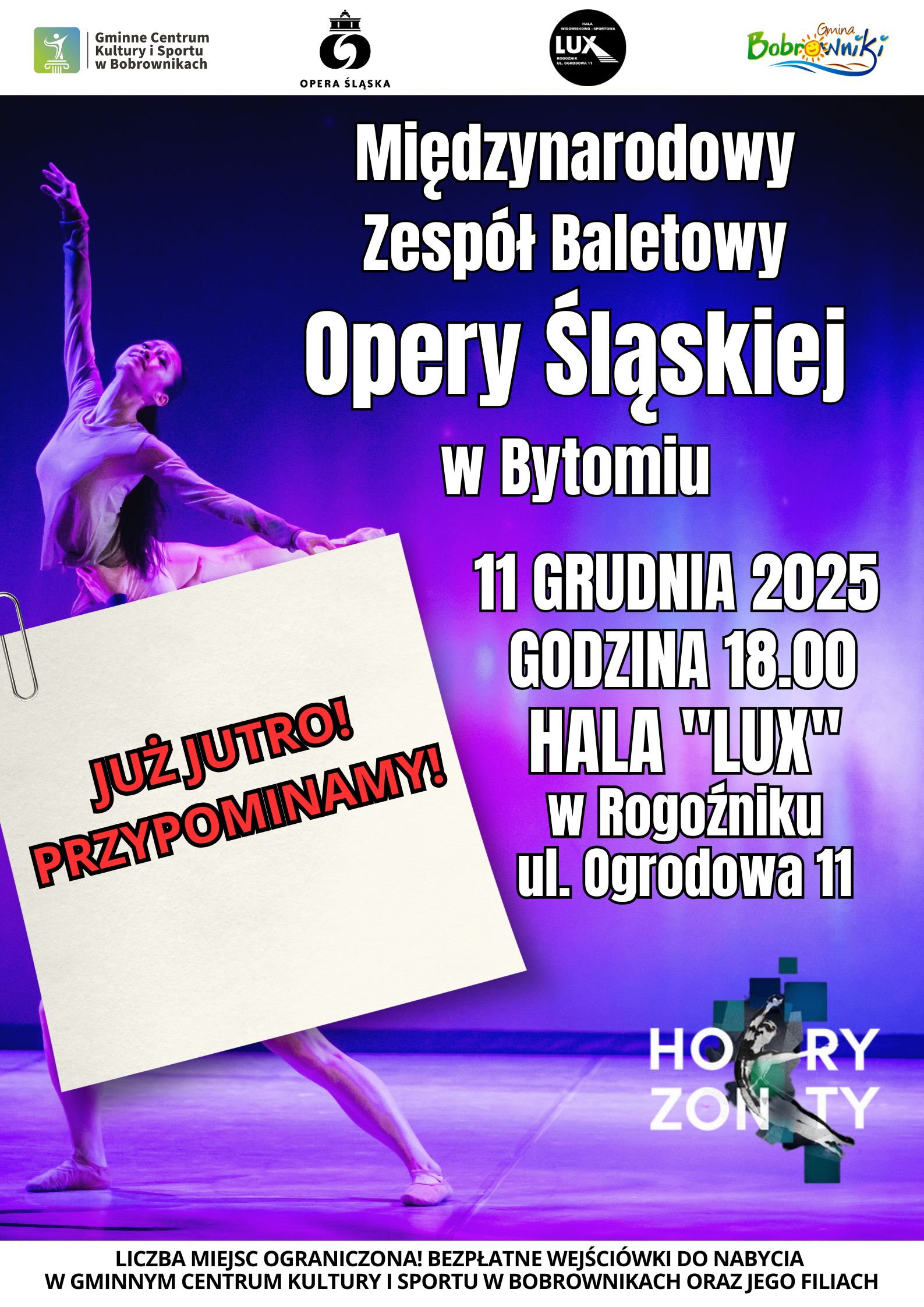 PRZYPOMINAMY WSZYSTKIM, KTÓRZY POSIADAJĄ WEJŚCIÓWKI Już jutro o godzinie 18.00 w LUX Gminna Hala Widowiskowo Sportowa będziecie Państwo świadkami niezwykłego [...]